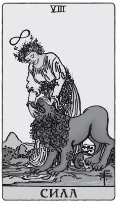 Похожую по цветам и элементам композицию мы увидим в аркане Сила, и это продолжение алхимического делания и самосовершенствования на пути духовного роста.