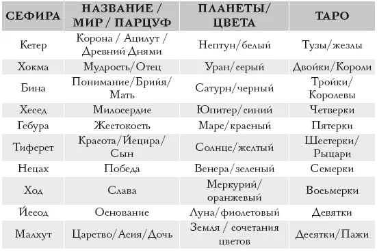 Эти пути соотносятся в Таро со старшими арканами (одиннадцатый путь алеф – Дурак и далее по порядку), благодаря чему старшие арканы и получают свою атрибуцию с буквами иврита, планетами и знаками зодиака по наследству от этих путей. Так, шестнадцатый путь от Хокмы до Хесед был сотворен буквой вав, ею же был образован знак Тельца, соответственно, помещая на этот путь пятый старший аркан Иерофанта, мы автоматически причисляем его ко всем соответствиям, которые связаны с этим путем. При этом важно понимать, что это аналогии, а не тождества, и знак Тельца, как и буква вав, – это не то же самое, что аркан Иерофант. Более того, каббала и Таро – это две разные системы, и их можно изучать отдельно. Но поскольку в Ордене Золотой зари такие соотнесения были, и они отражены в символизме, то я буду на них ссылаться.