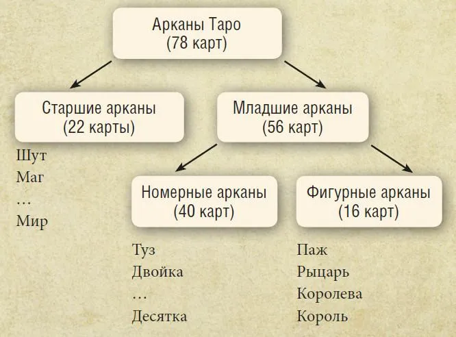 Числовые арканы – это по 10 арканов каждой из 4 мастей (от Туза до Десятки), а фигурные – по 4 аркана каждой масти (от Пажа до Короля).