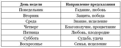 Каждый день недели связан с определенной направленностью предсказания. Таблица ниже поможет выбрать нужный день для работы с картами