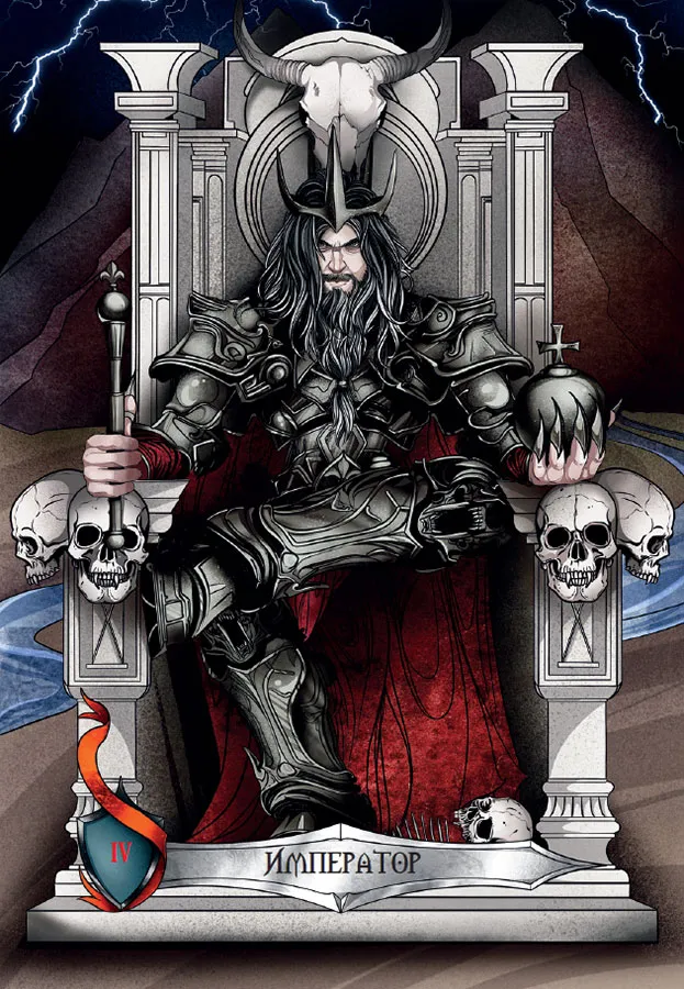 Путь к истинному безграничному могуществу может быть проложен разными путями. И страх (череп, темнота, молния) – один из них, способный заставить кого угодно преклонить колени перед правителем. Но только прирожденный Император, удерживающий железной (доспех) непоколебимой рукой власть (трон, скипетр, держава), отважится использовать этот способ. Статус Императора – ни в коем случае не результат везения, череды счастливых случайностей или милости высших сил. Чтобы занять свое положение на вершине человеческого общества, растоптать всех врагов и соперников (череп), Император пускает в ход все доступные ему хитрости и приемы. В полной мере он проявляет упорство (бык), уверенность и наглость (красноречивая поза), весь масштаб своих знаний, умений, показывает величие своего характера (реки и горы, чувства и материя). Поэтому Императора боятся, почитают и любят (красный цвет), поэтому его власть неоспорима.