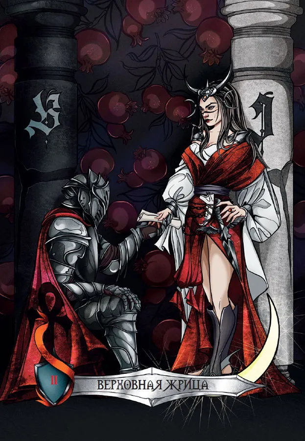 Она влечет и манит к себе, всем своим видом олицетворяя страсть (красный цвет одежд). Кажется, что стоит лишь приложить немного усилий – и можно заполучить эту женщину. Но каждого, кто так помыслит, ждет разочарование. Жрица отрешена от земного, она похожа на таинственную богиню (луна под ногой, украшения на голове), погруженную в безграничные воды бессознательного. Ей подчинен лунный свет. Жрица использует его для того, чтобы подсветить страждущим соратникам (красное одеяние рыцаря) истину и глубокие знания (свиток). Сама же она всегда остается верным стражем мистического храма (белая и черная колонны за спиной), источника ее мудрости. Взор Жрицы обращен к духовной сфере и возможности черпать из нее силу. Ее мир – это невидимое глазу и недоступное неподготовленным. Плотское и скоротечное ее совершенно не интересует.