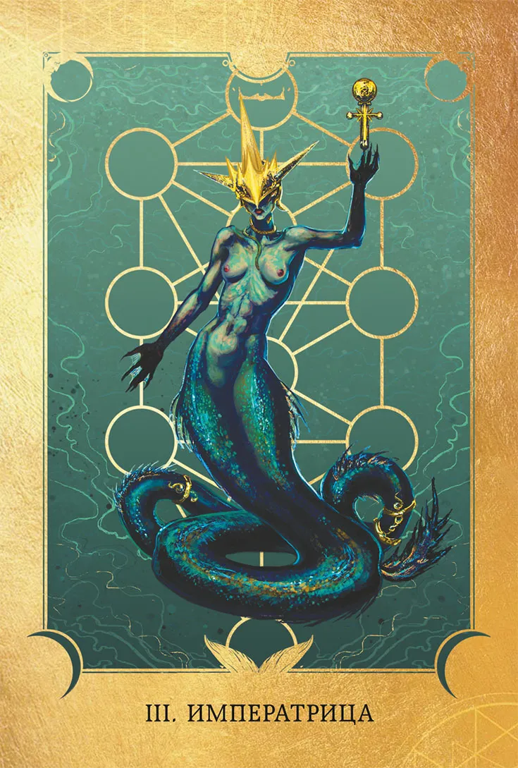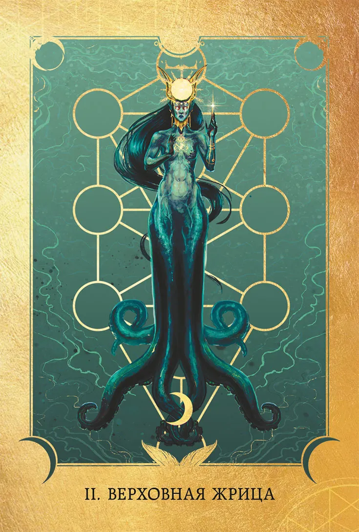 Морская ведьма предстает в виде рогатой богини-праматери. Между ее рогов сияющий диск, ночное светило, которое обладает солнечными и лунными свойствами одновременно. Но Солнце ночью скрыто в стране мертвых, оно озаряет то, что скрыто под землей. Жрица опирается на скрытые знания, те, что хранятся в темных лабиринтах разума. Интуитивные озарения – это послания из подсознания, им стоит доверять.