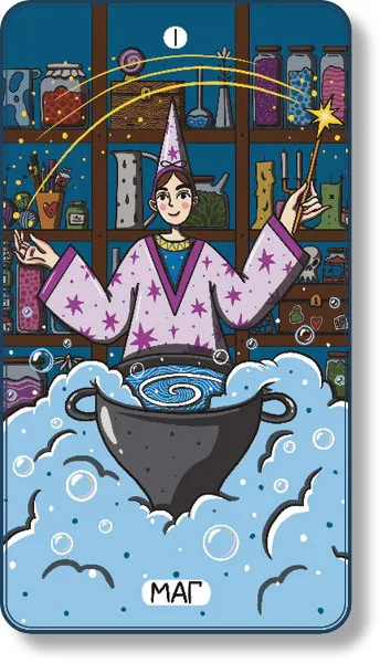 Маг сидит над кипящим котлом, создавая колдовское зелье. В руке он держит волшебную палочку, один взмах которой творит удивительные чудеса и рассыпает звезды. Это символизирует его способность направлять и контролировать сокровенные силы.