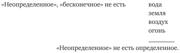 Таким образом, абстракция первоначала, всеобщего появляется как отражение одной из сторон движения и изменения объективного мира. Сначала это всеобщее пытаются представить в форме чувственного и особенного, но это приводит к противоречиям, и тогда появляется абстракция неопределенного (бесконечного). Пока эта абстракция является чисто отрицательной. Сама по себе она еще не имеет никакого смысла, никакого содержания. Она только отрицает всякую чувственную определенность, выражает лишенность. Она находится еще в худшем положении, чем остальные абстракции, которым соответствуют хоть какие-то чувственные образы. Абстракция неопределенного, бесконечного отрицает чувственное и благодаря этому теряет все свое содержание. Но в противопоставлении последовательно всех чувственных определенностей их отрицанию рождается абстрактное понятие. Сама эта форма противопоставления является первой простейшей формой понятия.