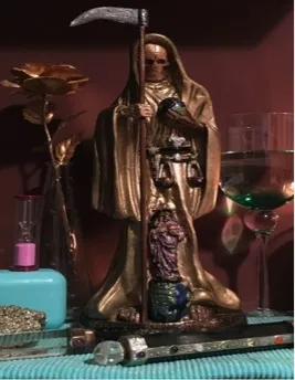 Find a place where you would like to set up your altar. Put the shelf, if you wish, and the tablecloth, and place the image of the Most Holy Death in the middle. In front of the image put the ashtray and in the ashtray put the magnet stone, the needles, and the cross of Christ. Place the vase with the roses next to your Holy Death, and the honey and the brandy on the other side. Light two incense sticks and let them burn out.