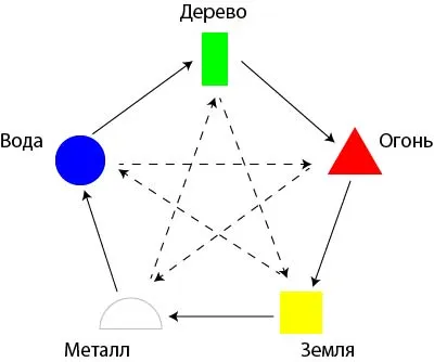Внешние стрелки показывают цикл порождения: Огонь порождает Землю, Земля – Металл, Металл – Воду, Вода – Дерево, Дерево – Огонь.