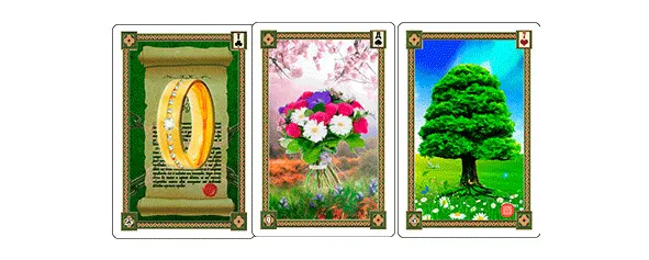 – Кольцо+Букет – зачастую обозначает предложение руки и сердца, а также помолвку. Если рядом будет находиться карта Сад, то в случае уместности такого предположения, может обозначать свадьбу.