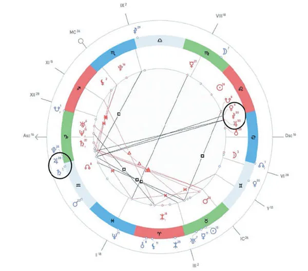 ♦ В его карте управитель 7-го дома Уран и Сатурн. Его Сатурн делает трин на мою Луну, упр. 7-го дома. Гармоничная точная связь на длительные отношения между элементами 7-го дома. Но и его Уран делает трин на мою Венеру в 7-м. Гармоничные связи на отношения и брак дали нам возможность быть вместе полтора года.