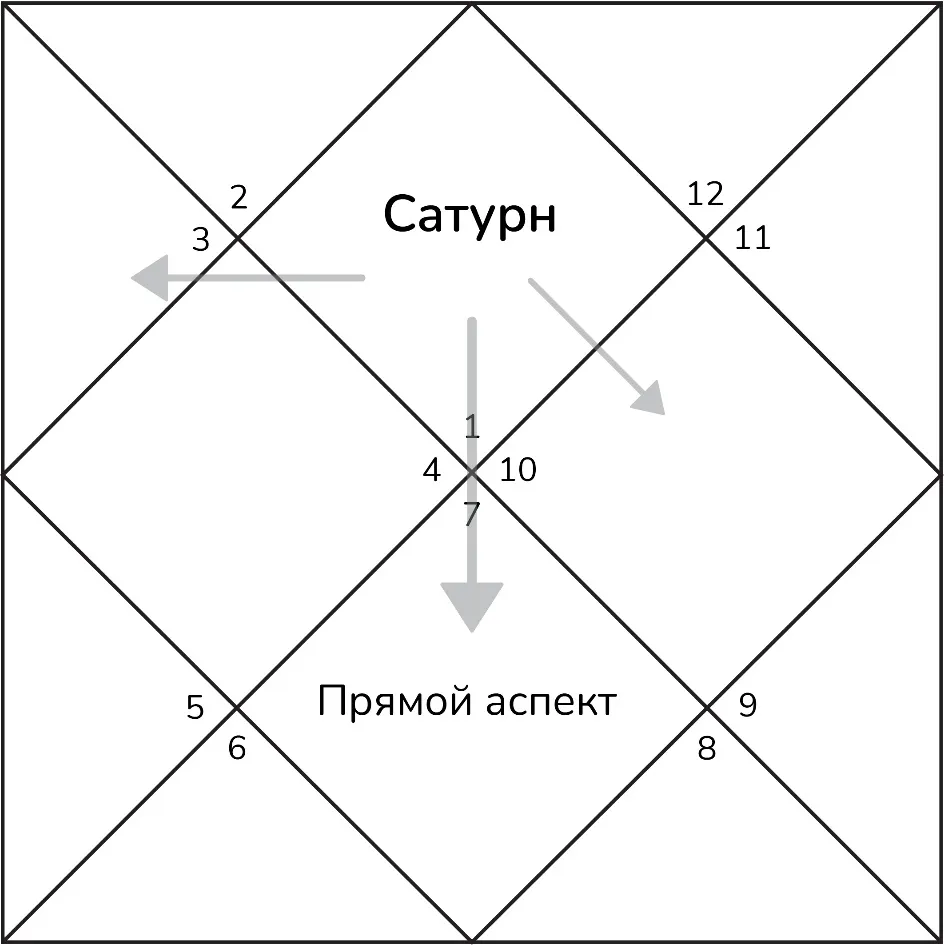 Сатурн даёт прямой аспект на седьмой дом от себя (самое сильное влияние идёт на дом, где он находится, затем на седьмой дом от себя), а также аспектирует третий и десятый дома от себя.