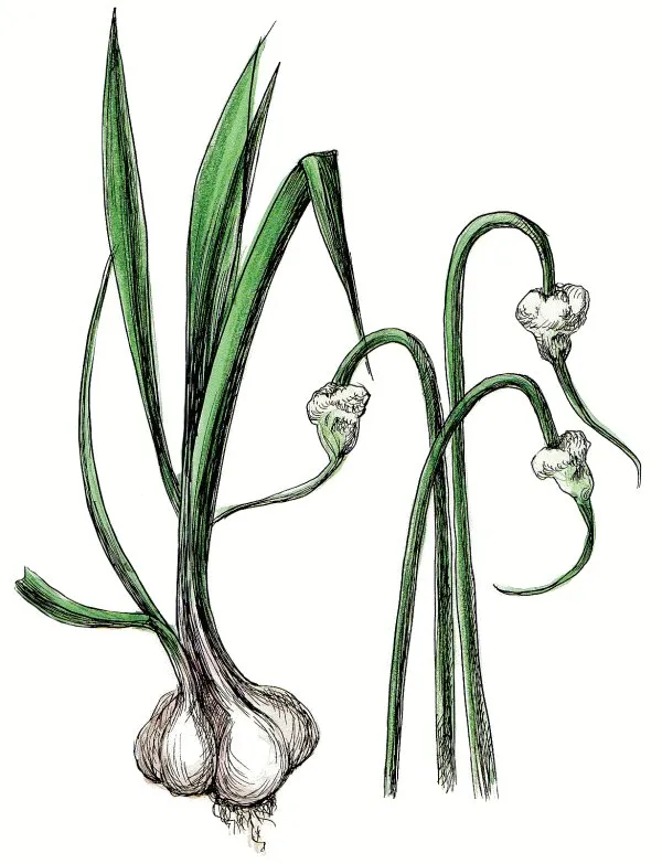 Как выглядит луковица чеснока, разумеется, знают все. Само растение чеснок огородный имеет мясистый стебель, до половины одетый листовыми влагалищами, до метра высотой, и длинные, узкие, плотные листья. Все части растения с сильным, резким запахом. Цветки мелкие, белые, собраны в малоцветковый зонтик. В зонтике развиваются многочисленные маленькие луковички. Культурный чеснок потерял способность размножаться семенами и размножается двумя способами: зубками и луковичками. Из высеянных луковичек в первый год формируются небольшие луковицы с одним зубком, который на другой год разрастается в сложную луковицу. Зубки высаживают ранней весной или поздно осенью.