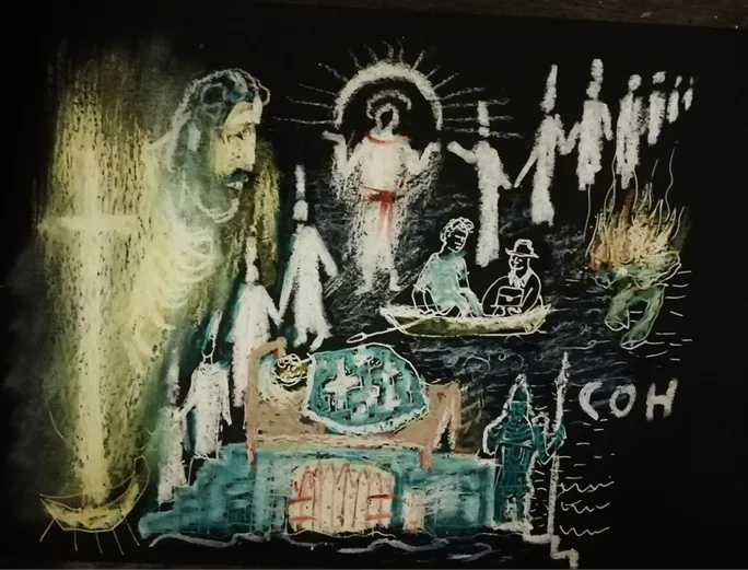 Они были одеты в длинные хитоны светлых тонов и молчали, словно в ожидании важного события. У стены стоял высокий белый алтарь на котором я с удивлением заметил золотой крест, а под крестом стояла золотая чаша, украшенная драгоценными камнями.