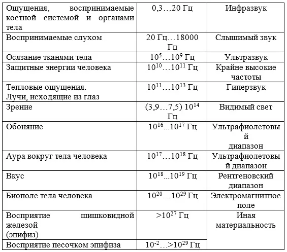 Ткани биотела человека, рецепторы чувств и некоторых его желез имеют следующие диапазоны восприятия частот волн.