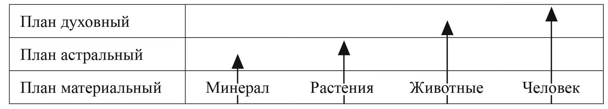 Как видим, три вертикали – символы трёх «главных царств земли»: минерального, растительного и животного, пронизывают горизонтальные полосы – символы трёх миров: духовного, астрального и физического только до определенного уровня, соответствующего условно степени эволюции того или иного царства. И только вертикаль «человек» пронизывает все планы, упираясь остриём в «потолок» верхнего (духовного) плана.