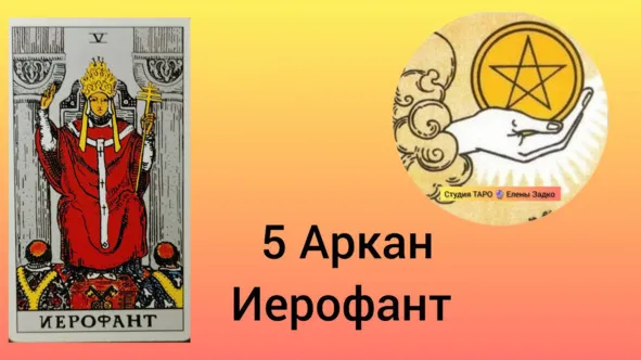 На сером фоне, между цементными колонами, на бетонном троне сидит иерофант/ жрец / папа в красной одежде на груди изображение крестов, на голове трех ярусная корона, перед его ногами сидят два человека, правая рука иерофанта поднята в верх, пальцы сложены в мудру., или жест благословения, в левой руке он держит символ своей власти, золотой крест.