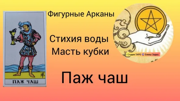 на сером фоне в розовой одежде юноша, его левая рука опирается на пояс, в правой он держит золотой кубок в котором видна рыбка, на нем голубая туника с изображением цветов лотоса, необычный головной убор напоминает ручей или водоем по зади пажа.