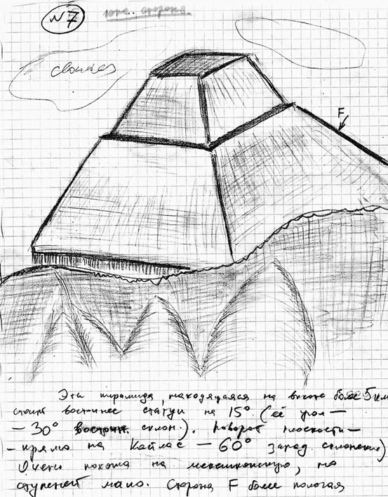 Отойдя назад, я зарисовал эту пирамидальную конструкцию: получилось, что она имеет форму усеченной пирамиды с одной ярко выраженной ступенью. И, конечно же, надо сказать, что эта пирамидоподобная гора была громадна, намного больше, чем пирамида Хеопса.