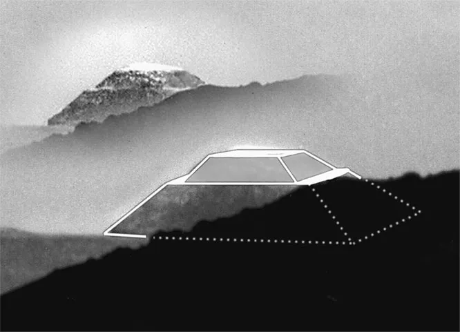 Когда нам удалось заглянуть за хребет, то мы увидели, что от пирамидальной горы отходит какая-то дугообразная конструкция, заканчивающаяся симметричным выступом со ступеньками. Внутри этой дугообразной конструкции все еще висел полупрозрачный клок утреннего тумана, сквозь который просматривалась эта дуга. Я понимал, что туман значительно снизит качество снимков.