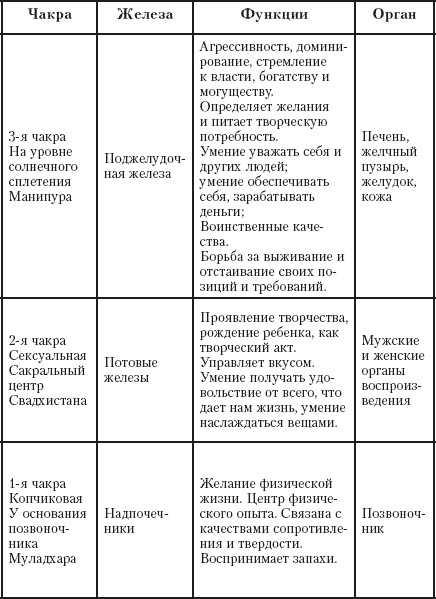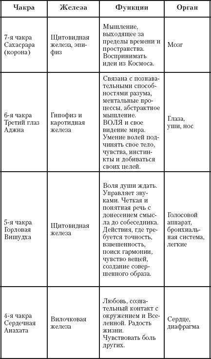 В теле человека существуют энергетические центры, которые йоги называют чакрами. Каждая чакра имеет свой энергетический уровень и связана с определенной железой, выделяющей гормоны (табл. 1).