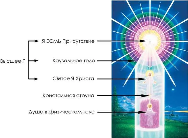 Душа представлена нижней фигурой на схеме. Как же эта душа, которая сейчас обитает в плотном физическом теле, соединяется с бескрайней кладовой духовного света своего каузального тела? Свет сходит к душе по так называемой кристальной, или серебряной, струне, которая на схеме показана в виде тонкой белой линии. Струну, которая исходит от Бога Отца-Матери из Великого Центрального Солнца, можно сравнить с пуповиной, которая соединяет младенца в утробе с его матерью. Это – «спасательный трос», связывающий нас с Духом. Божественная энергия течёт от Бога Отца-Матери по кристальной струне к Я ЕСМЬ Присутствию и затем продолжает свой путь к душе, пребывающей в физическом теле. Прежде чем эта энергия достигнет души, она проходит через другую часть нашего сознания, которая называется «Святое Я Христа» и представлена на Схеме средней фигурой.