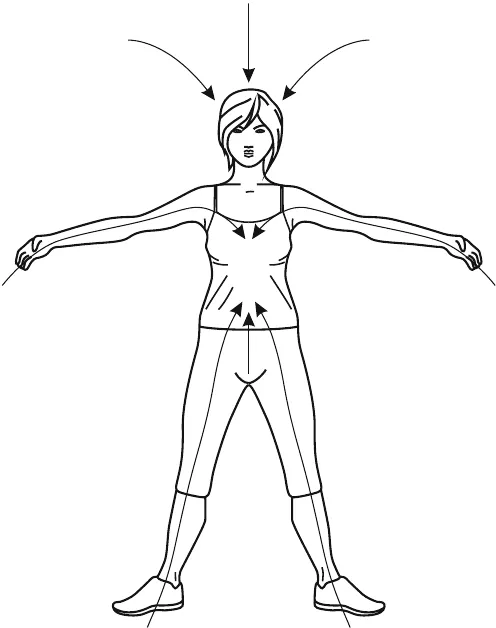 Рис. 1а. При зарядке энергия перемещается снаружи внутрь через голову, руки, ноги, кожу и гениталии
