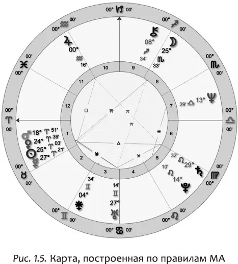 Давайте взглянем на натальную карту на рис. 1.5. Вы видите линии, соединяющие планеты. Это и есть аспекты.