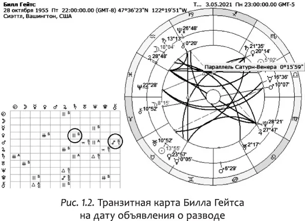 При совмещении натальной карты Билла Гейтса и транзитов на то время, когда появились новости о разводе, самый точный аспект – оппозиция от Хирона к Марсу (рис. 1.2). В МА брак ассоциируется именно с Хироном (в отличие от любви и взаимоотношений – за них отвечает Венера), и его оппозиция к Марсу – очень негативный аспект для брака. Но нет никаких точных негативных аспектов к Венере (Луну мы сейчас не рассматриваем). Значит ли это, что астрология не работает? И здесь мы видим демонстрацию значимости склонения и аспектов склонения: транзитный Сатурн в это время образует точную параллель к натальной Венере Гейтса. В привычном изображении карты этого не видно, но подключив в астропрограмме возможность отображения аспектов склонения, мы видим эту параллель вполне наглядно. На рис. 1.2, выполненном с помощью Астропроцессора Zet, эта параллель изображена в виде дуги на круге карты. К ней подведен курсор мыши, и на всплывающей подсказке есть информация об этом аспекте: параллель Сатурн-Венера, точность 0° 15′ 59″. Есть информация об этой параллели и в таблице взаимных аспектов транзитной и натальной карт, где обведены символы параллели (Сатурн-Венера) и оппозиции (Марс-Хирон).