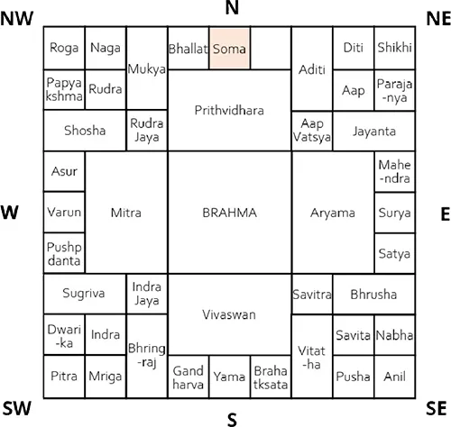 В следующей таблице, разделённой на 9 одинаковых частей, относящихся к 45 магнитным полям, планируют здания по Васту. Таблица накладывается на план здания соответственно направлениям компаса, чтобы все места в доме идеально отвечали своим функциям.