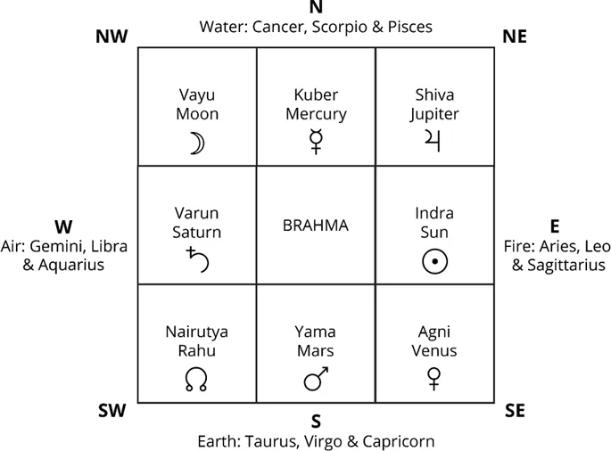 Не только различные боги влияют на места в доме. Кроме 45 богов есть управитель, следящий за каждым кардинальным направлением, а также есть астрологическое влияние звёзд и знаков Зодиака на каждое из направлений.