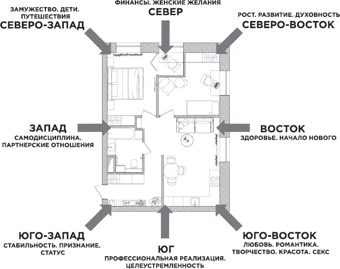 Если вы настроены получить максимум от прочтения этой книги, я рекомендую вам сделать васту-карту своего дома и вооружиться ею, чтобы иметь четкое и ясное представление, где у вас какой сектор в доме и какие плюсы и минусы в нем есть. Мы не определяем стороны света по компасу. Компас, даже встроенный в телефон, дает искажение расчетов. Почему? На него оказывает воздействие множество внешних факторов: электромагнитное излучение телевизоров, компьютеров, планшетов, электроприборов. Компас дает погрешности из-за железобетонной конструкции наших домов. Так что возьмите план своей квартиры, найдите ваш дом на карте города (используйте карты Яндекс или Гугл, где север всегда расположен наверху), зайдите на мой канал YouTube и посмотрите видео под названием «Васту с чистого листа, или Как сделать васту-карту». В этом видео вы найдете подробную инструкцию, как сделать васту-карту своего жилища.