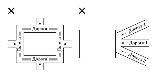 Подъездная дорога должна проходить вдоль границ участка, а от нее должен ответвляться въезд на ваш будущий участок. Знаю, что многие любят выбирать участки в самом отдаленном углу поселка – в тупике. Но часто такая тупиковая дорога упирается прямо в участок (Т-образная развязка), а это очень неблагоприятно. Избегайте участков, в которые упирается дорога или несколько дорог (рис. 3). Такие дороги называются «ударяющими» или «колющими». При этом неважно, с какой стороны света расположена такая «ударяющая» дорога, – с любой стороны она будет приносить негатив и разрушение в ваш дом и вашу семью.