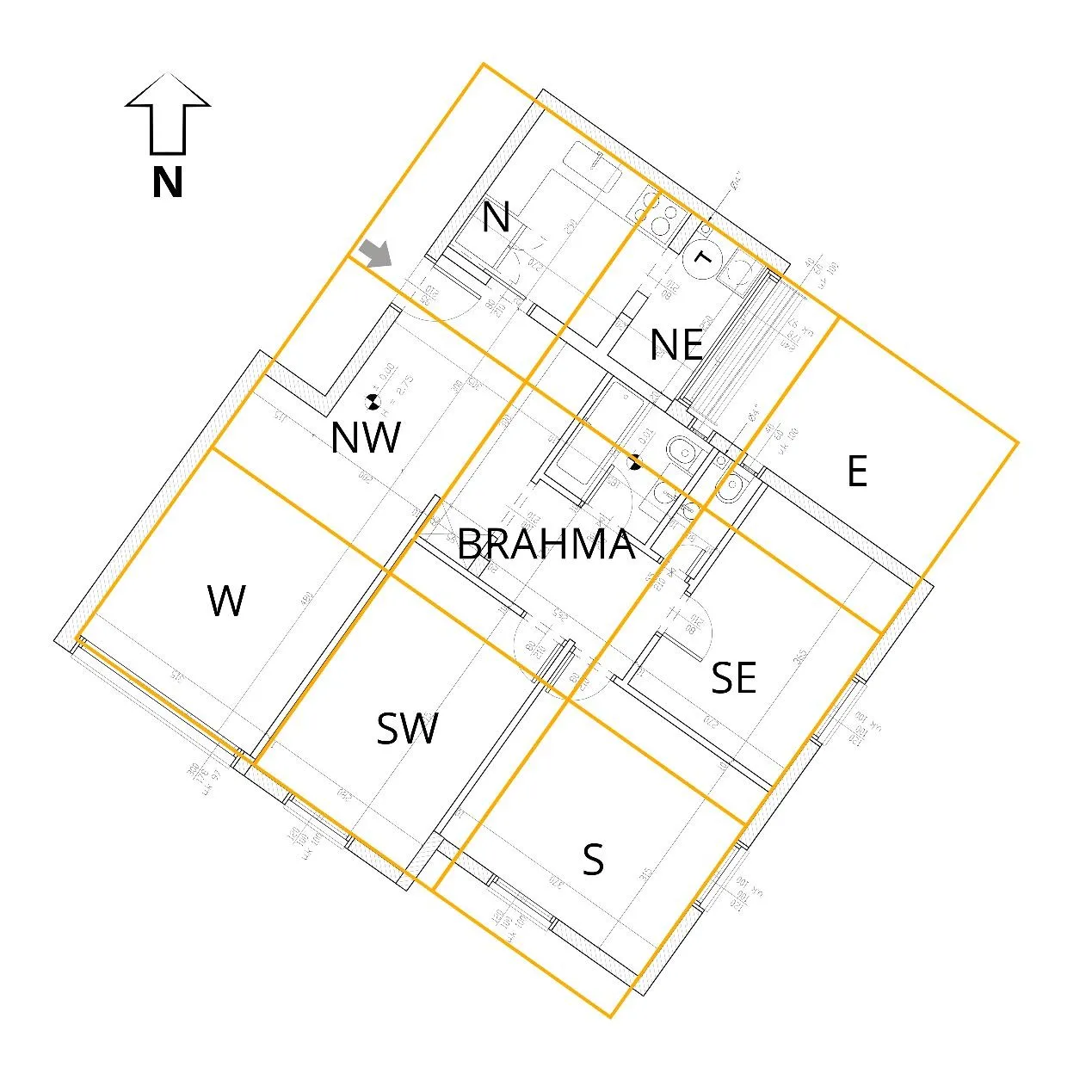 When preparing to renovate or apply corrections in a house not aligned with the cardinal directions, it is important to determine by how many degrees the house is tilted. Even if the tilt is less than 20 degrees, the exact positions of all directions must be checked. For this reason, one marks the locations of the deities (those that can be identified), the location of Brahma Bindu, the four padas surrounding the Brahma Pada (these must shift slightly in the direction of the tilt), and the 32 outer padas.
