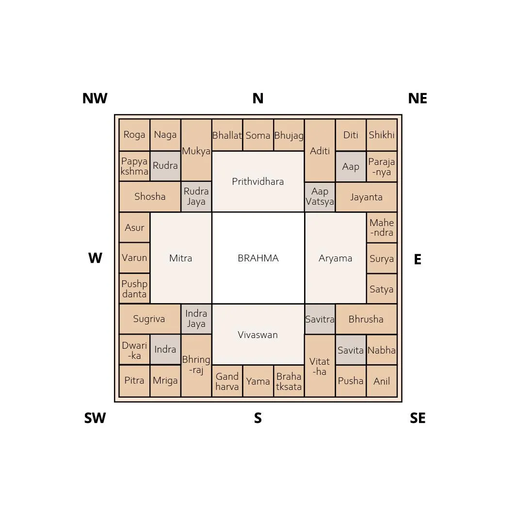 Ideally, the deities in the Vastu Purusha Mandala are divided into four layers of padas: the central Brahmasthan, surrounded by the Devata layer (divine beings), surrounded by the Manushya layer (human-like deities), surrounded by the outer Pishachya layer, consisting of 32 demonic deities.