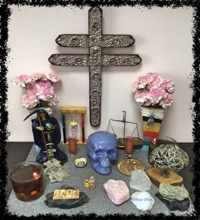 Данный цвет помогает в лечении нарко- и алкогольной зависимости и потому чаще всего встречается в реабилитационных центрах. Обычно под образом Санта Муэрте оставляют листочек с именем страдающего той или иной зависимостью, и Она начитает творить с больным настоящие чудеса.
