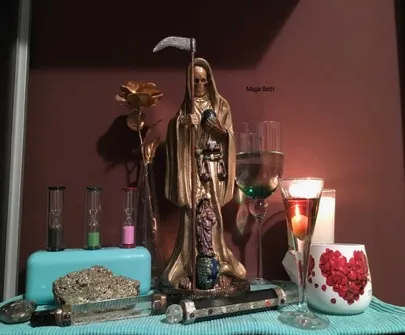 Найди подходящее место для алтаря. Накрой подставку скатертью и расположи изображение Санта Муэрте по центру. Поставь перед ней бокал с водой и повтори: