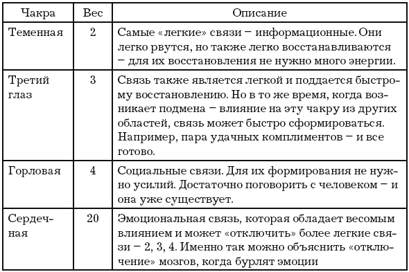 У каждой связи, равно как и у каждой чакры, есть понятие удельного веса. Это понятие условное. Оно характеризует силу и крепость взаимодействий. Чем «тяжелее» связь, тем она крепче и тем сложнее ее разрушить как извне, так и изнутри.
