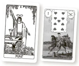 Если вы посмотрите на набор двоек в картах Таро, то заметите, что они затрагивают те же темы, что и карты Ленорман с ключевым числом два. Двойка Пентаклей является отражением Клевера. Обе они связаны с производимыми колебаниями. Баланс сил смещается, но он еще не настолько неустойчив, чтобы перевернуться, как в случае с Метлой и Плетью. С их помощью создается дуга напряжения, которая заставляет силы, жонглирующие друг другом, вступать в диссонанс. Из возникающего диссонанса рождаются конфликты. Эквивалентом этого расклада в Таро является Двойка Мечей. Сад, напротив, стремится преодолеть такие противоречия и создать общее пространство. Этому же намерению следует сближающаяся пара на Двойке Кубков.