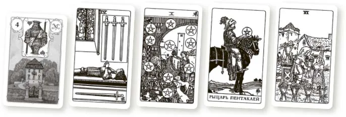 Вернемся на мгновение к Дому и немного изменим перспективу. Теперь давайте посмотрим, какие карты в Таро тематически соответствуют значениям этой карты Ленорман. Первое, что бросается в глаза, – это Четверка Мечей. На этой картинке мы обнаруживаем каменный фундамент, похожий на тот, что видим и на карте Императора. Однако у Четверки Мечей есть и другие значения, которые явно соответствуют другому аспекту Дома: уединению от внешнего мира в собственных четырех стенах, чтобы собраться с силами и зарядиться энергией. Такая же аналогия возникает с Десяткой Пентаклей. Семья, устои, стабильность, безопасность и дом входят в число понятий обеих карт. Интересно, что на этой карте Таро можно увидеть части зданий, которые, в свою очередь, весьма напоминают фасад Дома на карте Ленорман. Однако это изображение намного живее. Люди и животные контактируют друг с другом. В случае с картой Дома вы, возможно, заметите нечто подобное, только когда откроете входную дверь. Наша карта Ленорман также может быть связана с Рыцарем Пентаклей. Он усерден и добросовестно посвящает себя повседневной жизни, несмотря на ее однообразие и монотонность. Дом также можно найти в живописном пейзаже Шестерки Кубков: с одной стороны, мы видим здания на заднем плане, которые навевают мысли о надежном укрытии, как и наш Дом в колоде Ленорман. С другой стороны, эта картина напоминает о детстве, чувстве родного дома и безопасности, так как здесь мы видим двух симпатичных человечков, несущих кубки, наполненные цветами. Однако если мы чуть внимательнее рассмотрим эту карту Таро, то, помимо ощущения ностальгии по тихому миру, в котором все любят друг друга, возникает еще и чувство пресыщения и однообразия (что также отражается и в преобладании насыщенного желтого цвета). Стены привычного места могут не только защищать, но и ограничивать. Эти противоположные грани отражены и в значении Дома в Ленорман.