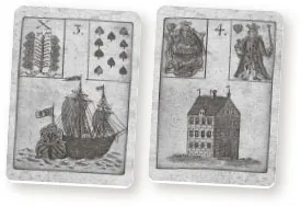 Для полноты картины мне хотелось бы остановиться на связи между колодой Ленорман и картами для игры в скат. Известна следующая предыстория. В самой первой публикации колоды Ленорман присутствовала карта с изображением «руки ската». Сегодня все еще существует несколько колод, в том числе «Голубая сова»5, которые сохранили это изображение. Согласно газетному сообщению того времени, истоки обретенных заново в 1799 году оригинальных карт Ленорман, которые позже были переизданы и продавались как салонная игра, восходят к знаменитому искусству гадания мадам Ленорман.