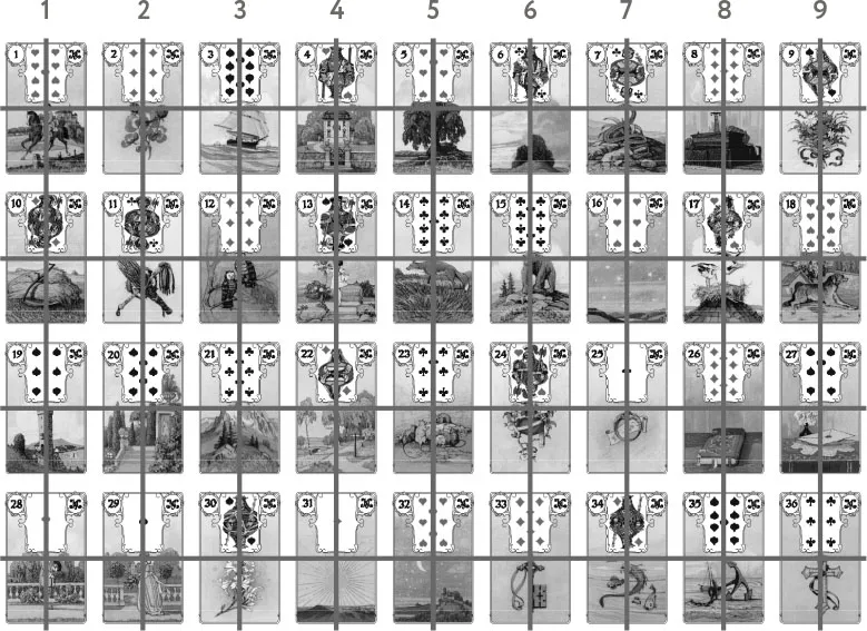 Большинству из вас хорошо знакома интерпретация нумерологической матрицы. Она составляет основу Большого расклада, который играет главную роль в практике толкования карт Ленорман. На мой взгляд, расклад 4×9 имеет явные преимущества с точки зрения возможных интерпретаций по сравнению с часто используемым методом 4×8 (только восемь карт в ряду, остальные четыре карты раскладываются в нижнем ряду посередине). После внимательного изучения обоих методов я пришла к выводу, что метод 4×8 становится все менее практичным и запутанным по сравнению с раскладом 4×9. Более того, я не встречала ни одного убедительного аргумента, который позволил бы назвать расклад 4×8 как более точный или удобный в использовании. Даже аргумент о том, что вы можете дополнительно получить четыре значимые карты судьбы или события (речь о них пойдет ниже), имеет мало оснований, потому что метод 4×9 не упускает никакой существенной информации, особенно такой, которая могла бы иметь незаменимую ценность. Будучи полностью уверенной в правоте таких выводов, в своей практике я долгое время ориентировалась на метод расклада 4×9. В ходе исследовательской работы над этой книгой мне удалось распознать в нем символическую опору колоды Ленорман, для которой метод 4×8 не дает совершенно никакой прочной основы. Ведь если принять во внимание числовые связи, появляется решающий компонент, который позволяет утверждать, что метод 4×9, как первоначальный расклад Ленорман, является основным. С какой системой лучше работать в повседневной практике толкования – остается вопросом вашей личной привычки и вкуса.