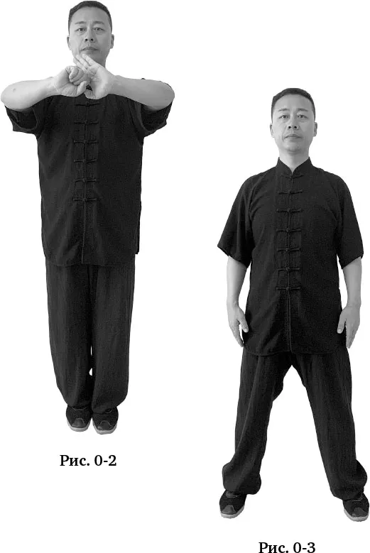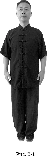 Встать в центре выбранного вами места для занятия лицом на юг1. Стопы вместе, тело ровное, макушка тянется вверх, руки опущены вниз по бокам, ладони касаются бёдер. Плечи расслаблены, дыхание естественное (рис. 0–1).