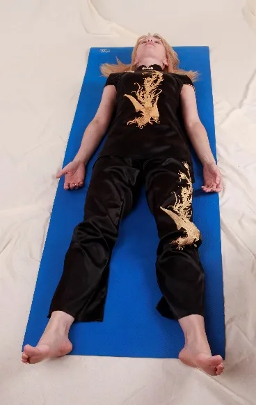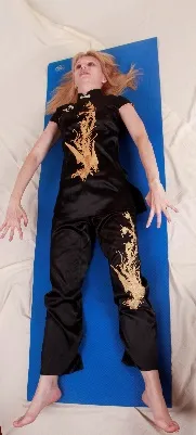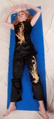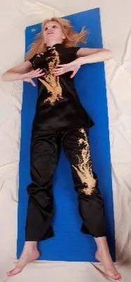 Из исходного положения руки через стороны поднимаем до уровня головы, ладони обращены к стопам. Начинаем выдыхать с еле слышным «хи-и-и-и-и», опуская руки к ногам и представляя, что руки толкают каток, который выдавливает из тела отработанный воздух, излишнее тепло, что-то еще неприятное: из верхней, средней, нижней частей грудной клетки, из живота сверху вниз. В данном случае «верх» – это голова, а «низ» – это стопы. Через кончики пальцев рук и ног остатки неприятных ощущений и жара уходят вон из тела.