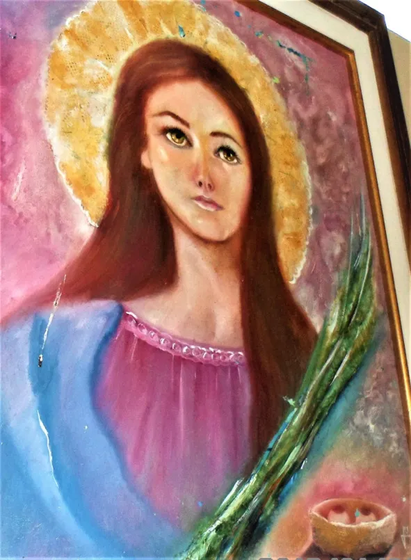 Любовь возникла при взгляде на изображение святой в притворе храма её имени в Сидаджи Нова в Белу-Оризонти, Бразилия – я там живу. То есть от взляда не на культовое, намоленное изображение, а на картину – как в галерее. Она висит около помещения секретаря. И внимания на неё не обращает никто. А рядом вообще абстрактное полотно…
