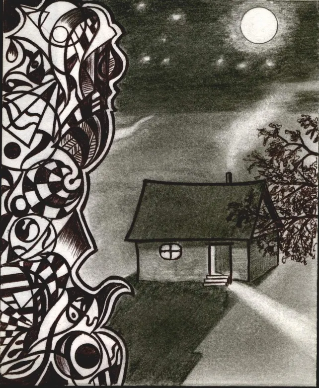 Я проплыл под полуразрушенной каменной аркой. На правом берегу валялись обломки статуй и мраморных колонн. Разноцветный туман исчез. Река лениво несла меня мимо позеленевших стен старинного зала. Под высоким потолком потрескивали факелы, отблеск которых дрожал на статуях несуществующих королей, возвышавшихся у самой воды. Но интереснее всего были четыре огромные картины, что висели по обеим сторонам на стенах. На одной я увидел странного зверя, держащего в лапах выструганную из коры лодку. На второй были нарисованы ворота на утреннем холме, одна створка которых валялась в папоротниках. Я проплыл мимо третьей картины. На ней раскинулось пшеничное поле, и пугало отгоняло ворон и во все стороны размахивало руками. Четвертой картиной оказалось обыкновенное зеркало в золотой рамке, в которое я увидел себя, плывущего в этом темном зале и рассматривающим картины. Треск факелов прекратился, я снова плыл по лесу. Где-то впереди из воды вылезло нечто желтобрюхое и скрылось в зарослях на берегу, так что хруст веток по всей чаще разнесся.