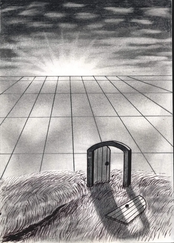 Небо опять прояснилось, утренний ветер разогнал набежавшие облака. На том месте, где недавно еще был Город, трепетали лис-тья молодого папоротника, плавно покачивались лепестки неизвестных цветов. Но самым удивительным было то, что городские Ворота остались стоять на том же самом месте. Правда одна створка была полуоткрыта, а другая и вовсе валялась тут же на земле среди лопухов и папоротника.