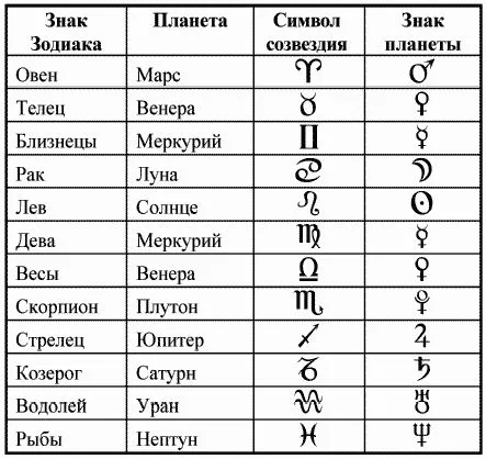 Таблица соответствия знаков Зодиака времени суток и дням недели