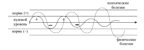 Значит, нам нужно заботиться о том, чтобы амплитуда колебаний наших жизненных энергий не выходила за пределы коридора нормы в коридор заболеваний. Нам нужно заботиться, чтобы эти большие волны постепенно становились меньше. Чтобы жизненная волна была такая, как мы ходим, – переступая с одной ноги на другую. У святых эти волны совсем маленькие. Если мы двигаемся в коридоре нормы, «плюс» нормальный и «минус» нормальный, они чередуются, – то это нормально. А вот если мы увеличиваем свои стрессы, тогда чем волна больше, тем заболевание хуже. Заболевания гордыни – это психические болезни, энергия стыда вызывает физические заболевания. От гордыни в нашем теле накапливаются легкие металлы. Стыд собирает в наше тело тяжелые металлы. Если мы от желания хорошего превысим верхнюю границу коридора заболеваний, то или умрем, или сойдем с ума. Так может быть, если рядом никто не скажет: не хорошо, может быть, не побьет меня даже физически. Если человек психически вышел из себя, делает сумасшедшие поступки, то помочь ему может только плохой человек, который так «даст ему по морде» или какому-то другому месту, что тот с испугу понимает все. И этот человек вернется с критического уровня, не сойдет с ума. Не умер человек, не стал животным.