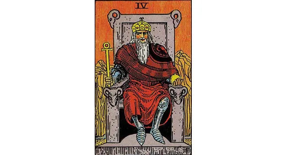 Но как только солнечный диск начинает освещать горы, неведомо откуда взявшаяся молния, ярко сверкнув, ударяет в землю. Если в этот миг зажмурить глаза, и вновь открыть их, то можно увидеть пред собой Великого Царя, восседающего на троне. Его поза непринужденна, правая нога заложена за левую, образуя крест. Все это говорит об уверенности Императора в своей силе и власти. Хозяин символизирует понимание того, что недостаточно желать мира и спокойствия или даже учить этому, нужно выработать способность их защитить. Четвертый Аркан рассказывает о тех ситуациях, когда препятствия не смогут преодолеть ни добрая воля, ни любовь, ни мудрость. И тогда необходима будет решимость поднять меч. Император показывает, что нельзя идти против своей совести, что достойное существование иногда требует борьбы.