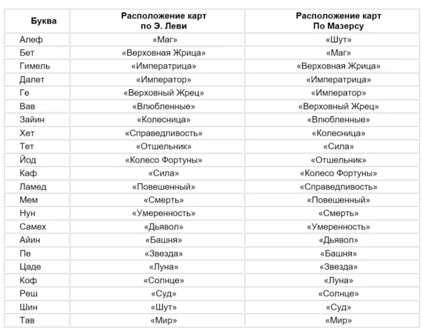 Еще одним отличием между английской и французской школами было то, что орден «Золотой Зари» сравнивал карты не только с мистическим учением Каббалы, но и с другими оккультными науками, например, такими как астрология. Леви же и его последователи не слишком обременяли себя глубокими знаниями. Зато они пользовались дополнительными значениями карт, а также уделяли внимание сочетанию нескольких карт.