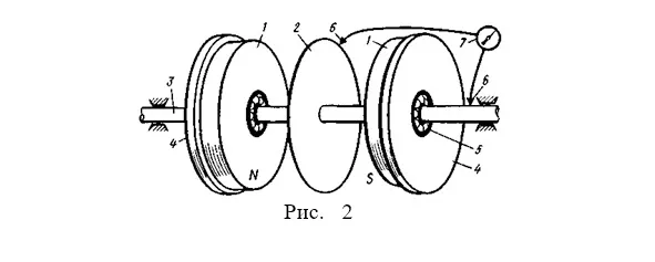 токопроводящий диск вращается в стационарном магнитном поле при неподвижных (заторможенных) магнитах;
